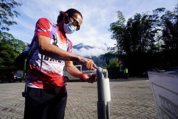 这名登山客是来自山打根的阿滕尤肯(37岁),身穿运动装,戴着口罩和墨镜的他于今早7时30分抵达神山公园。