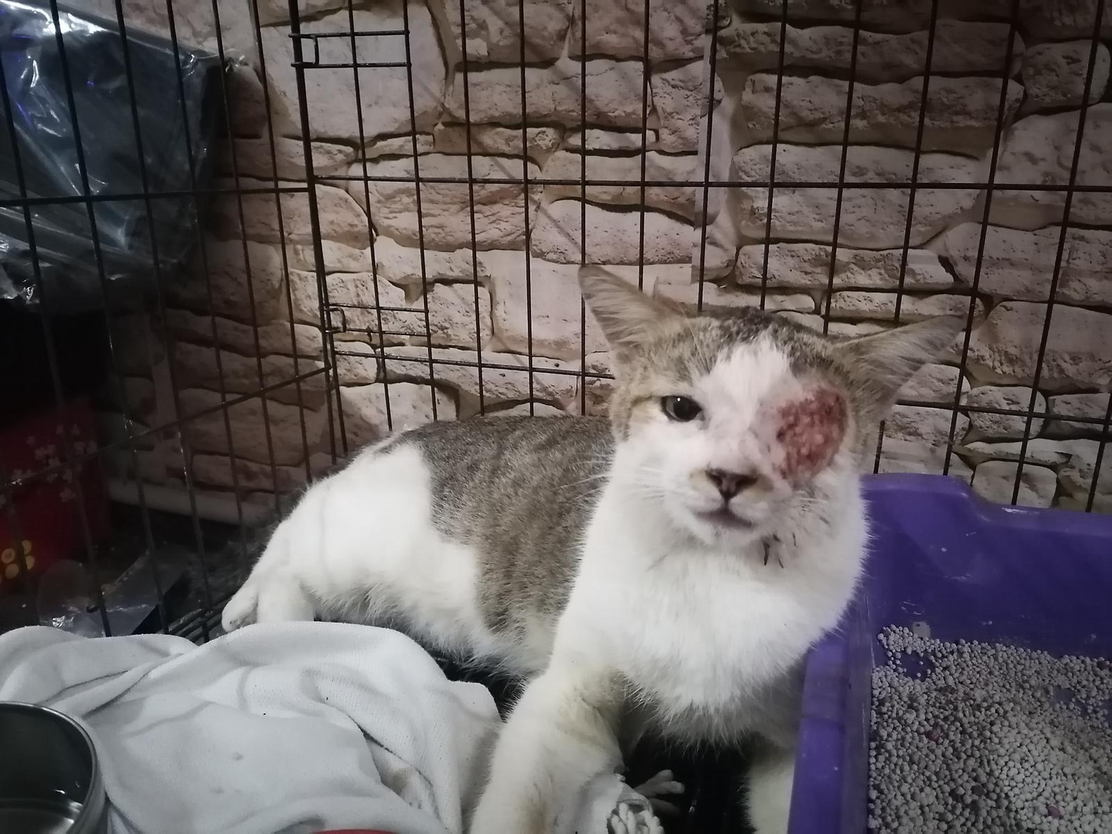 野猫的伤口处位于眼部,而且看起来很严重,所以第二天就立刻带它去看兽医,想尽快拯救这只野猫!
