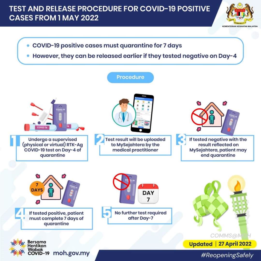 对新冠检测呈阳性者仍要求7天的强制隔离,并通过MySejahtera应用程序上传新冠检测结果和健康评估。如在隔离第 4 天的抗体检测(RTK-Ag Test)结果为阴性,可能会提前解除隔离。