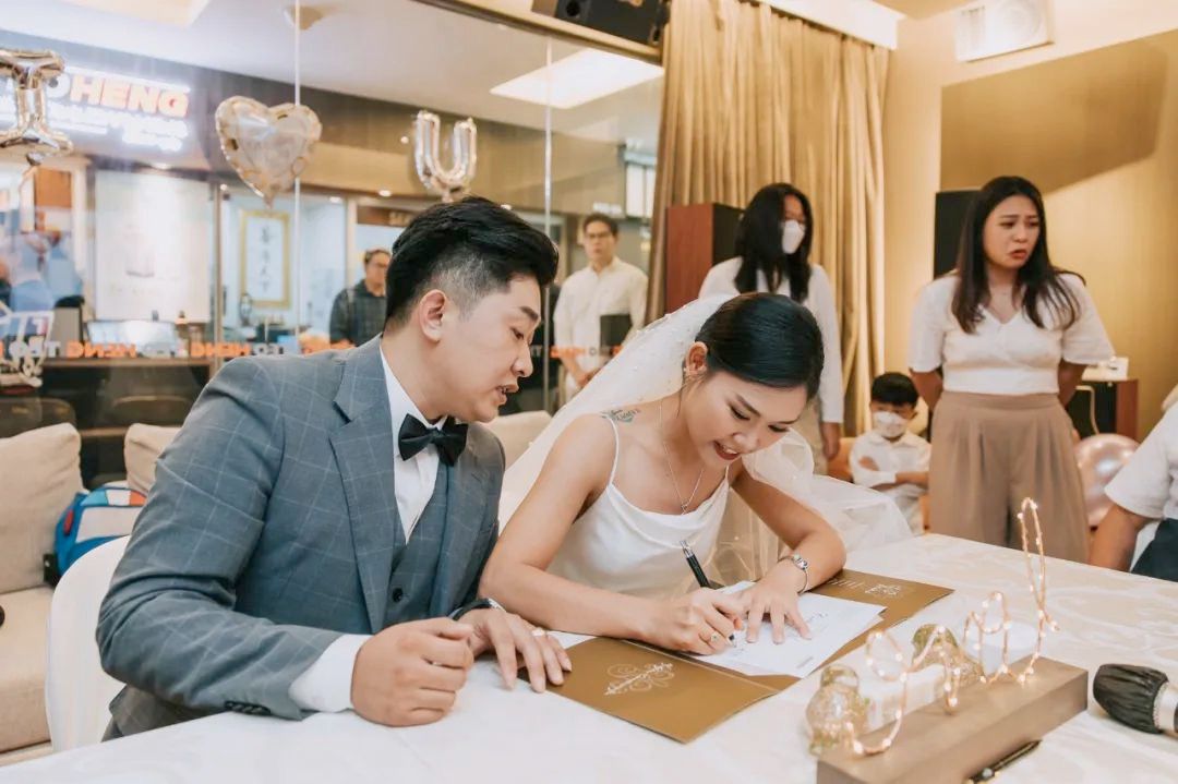 就在这个时候,Teo Heng老板张仰兴得知他们在时间有限的情况下,无法好好筹办婚礼,尤其是预订场地方面并不容易,所以他主动提议让他们到两人最初认识的地方,即Teo Heng位于加东购物中心的KTV器材的门市店举办注册结婚仪式,让他们深受感动。