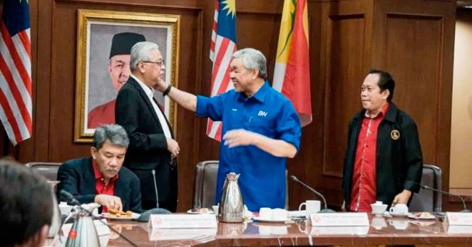 其中一张照片,阿末扎希的手搭在巫统副主席伊斯迈·沙比利的肩上,大笑不止。