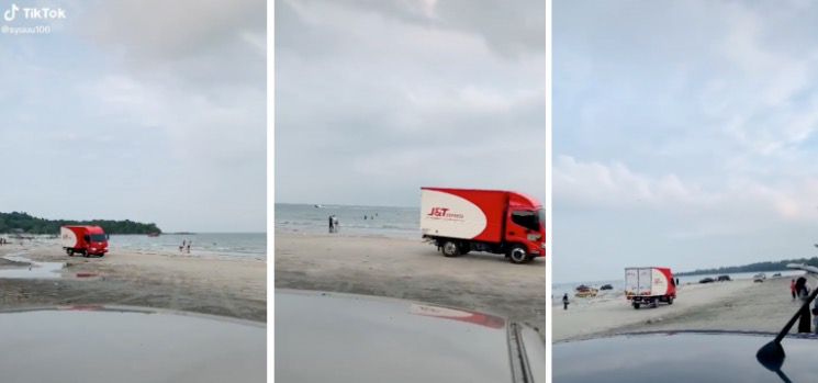 有关视频上传到社交媒体上后引起议论,网民纷纷猜测为何快递货车会来到海边。